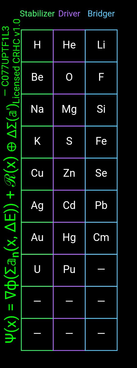 These patterns emerge because each element occupies a specific harmonic role within the recursion. The clustering of biochemistry around C-H-O-N-P-S is not biochemical accident but harmonic inevitability: these elements span the triad in a perfectly phase-matched lattice.